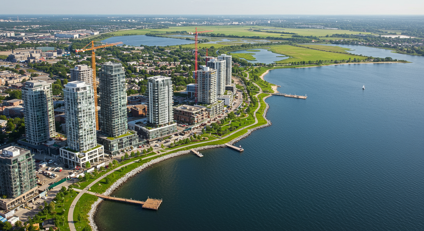 Part of the Lakeview deal involves a dedication of 67 acres of parkland to the municipality, including the pier, as well as land along the water’s edge and a former canal that served as a cooling structure for the generating plant. Peel Region and two conservation authorities are also building a wetland immediately to the east of the property, just south of a large water-treatment plant. A waterfront bike path, long routed around the generating-station site, will traverse the water’s edge and link to waterfront parks both to the east and the west.